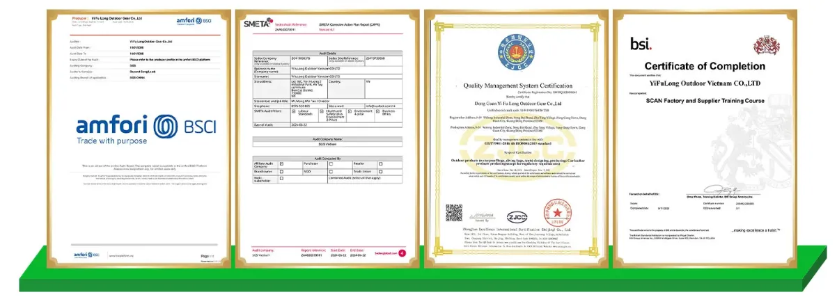 Kami telah berturut-turut memperoleh beberapa pensijilan berwibawa, termasuk ISO 9001 untuk pengurusan kualiti, BSCI/SMETA untuk tanggungjawab sosial, dan Indeks Higg untuk kelestarian alam sekitar.